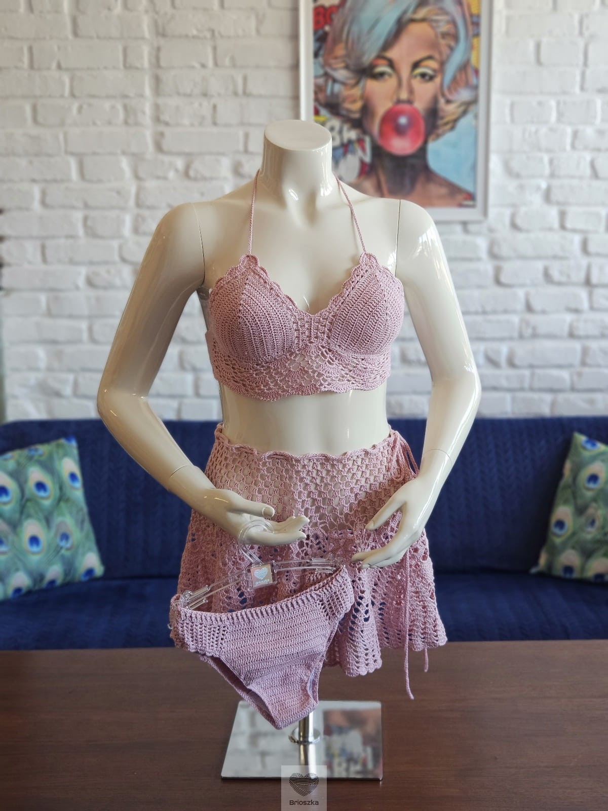 Ten zmysłowy komplet plażowy został wykonany w całości ręcznie z miękkiej, naturalnej bawełny, która jest przyjemna w dotyku i doskonale dopasowuje się do ciała. W skład zestawu wchodzi misternie dziergany top bikini z ozdobną lamówką, figi oraz lekka, ażurowa spódniczka wiązana w talii.