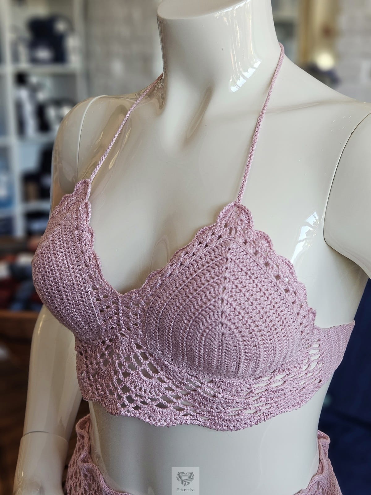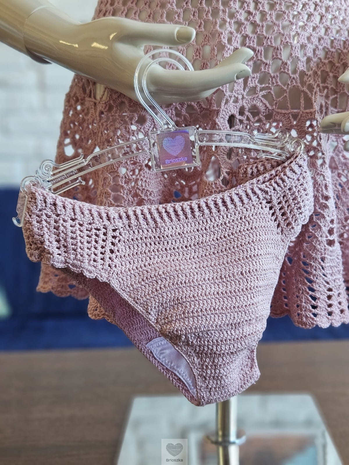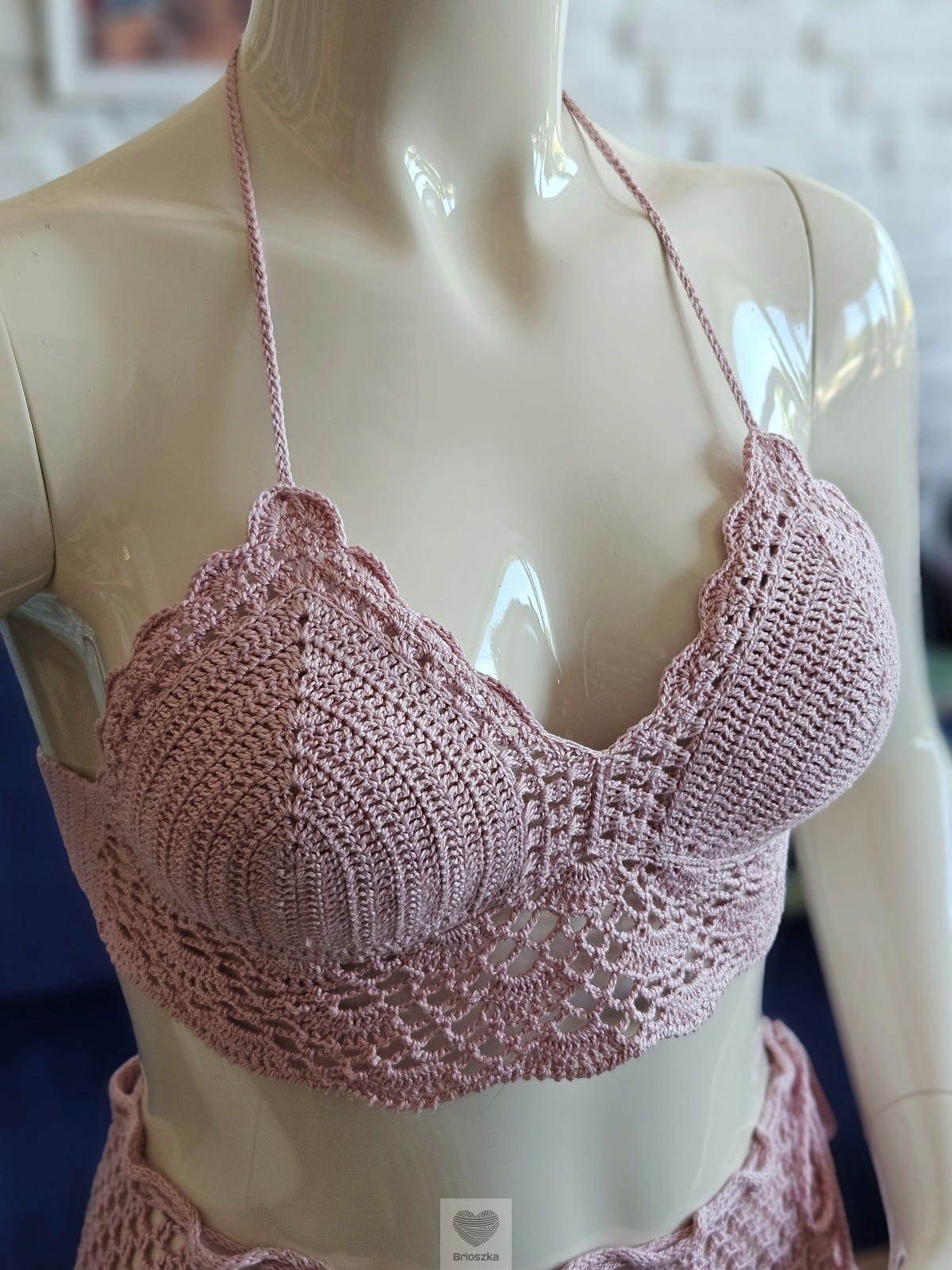 Delikatny pudroworóżowy kolor podkreśla letnią opaleniznę, a subtelne wzory szydełkowe nadają całości romantycznego charakteru. To idealna propozycja na plażę, basen czy wakacyjny wyjazd — wygodna, oddychająca i niezwykle kobieca.