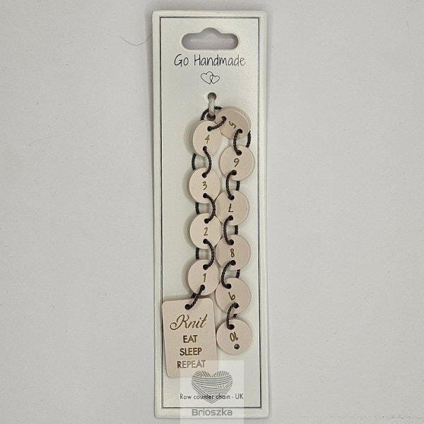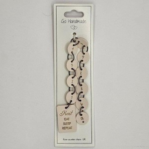 Licznik dziewiarski jest wykonany z drewna i metalu i jest niezwykle lekki, dzięki czemu nie obciąża drutów. Na końcu łańcuszka znajdziesz mantrę: Knit, Eat, Sleep, Repeat.
