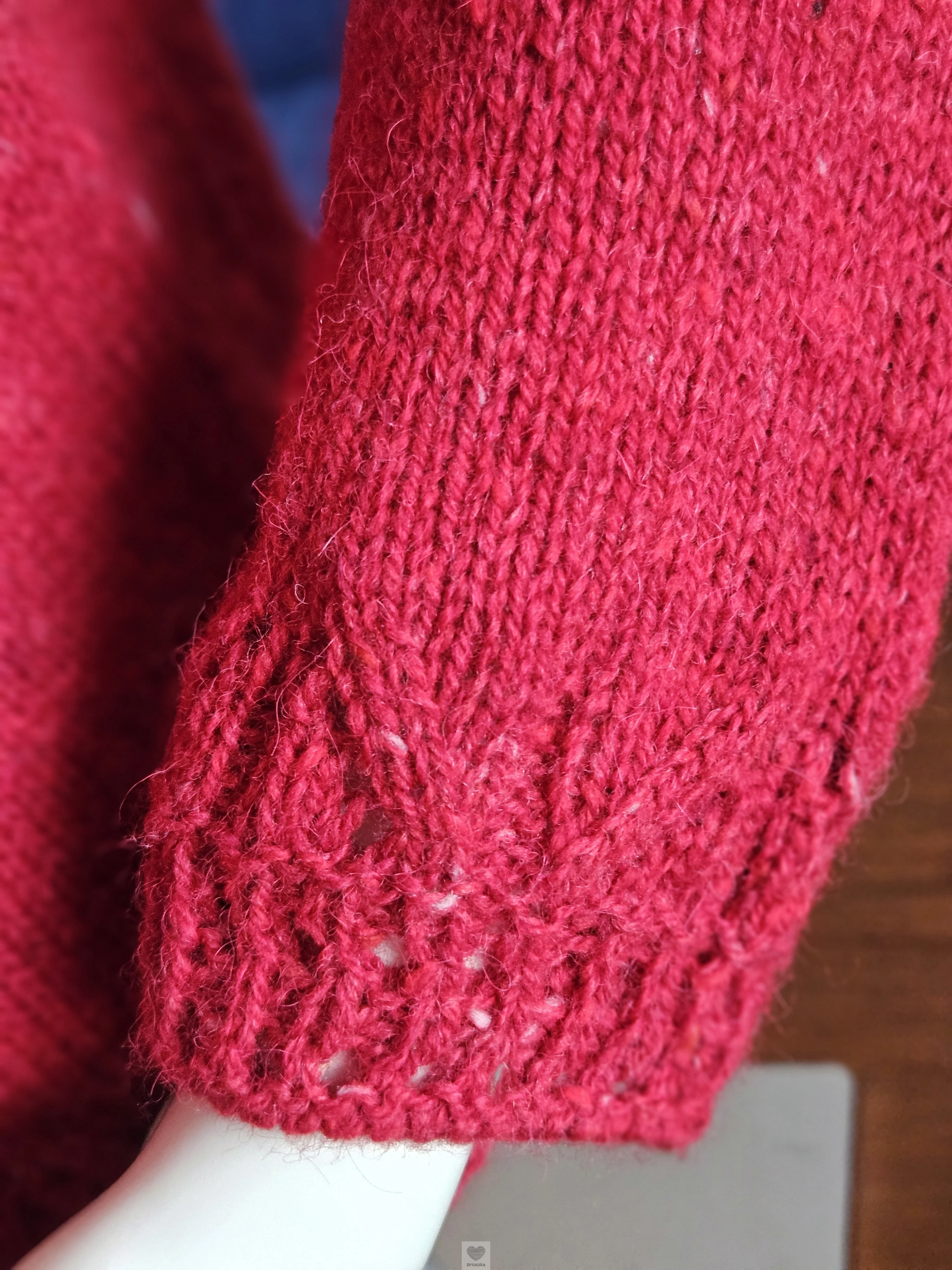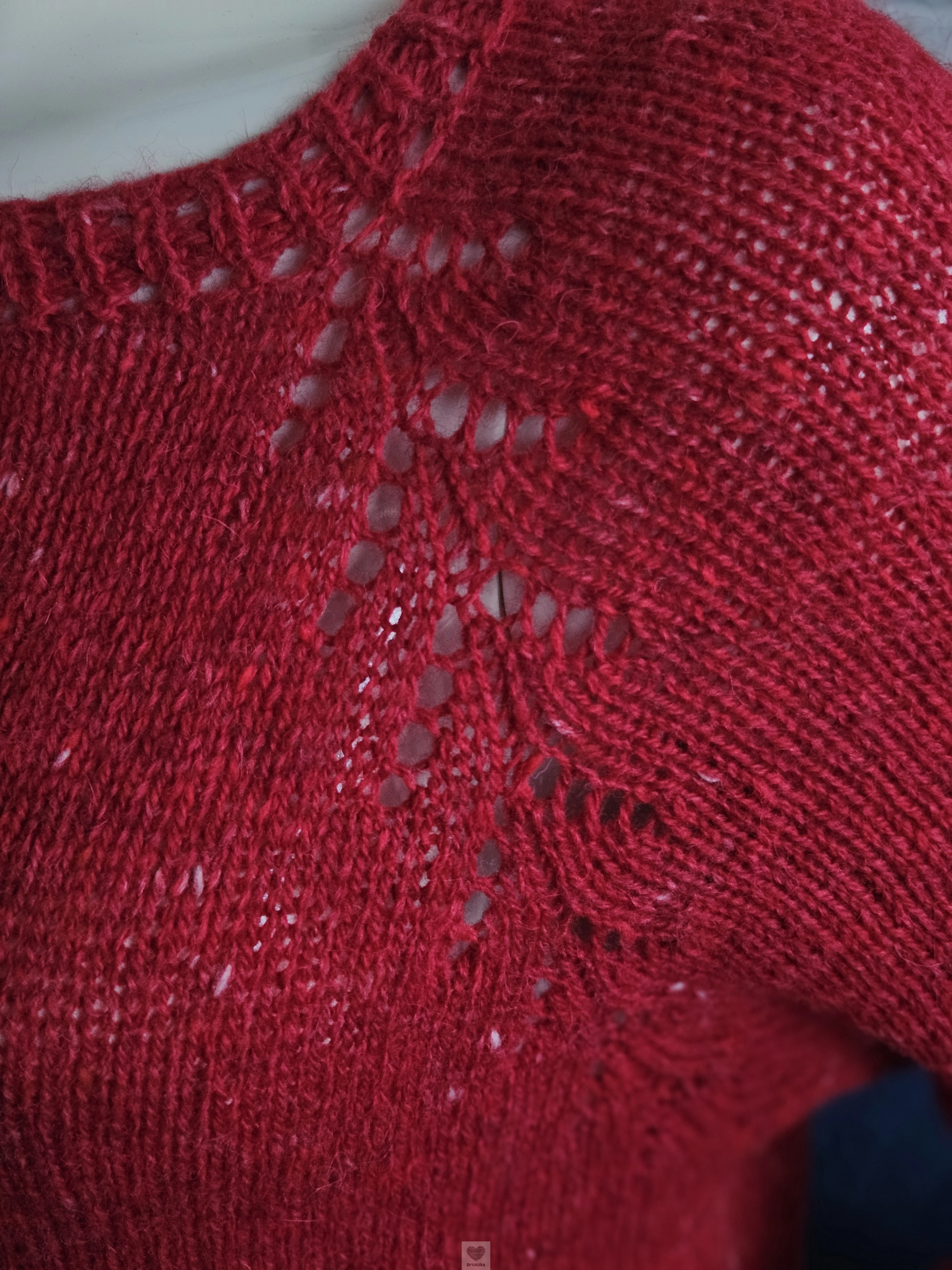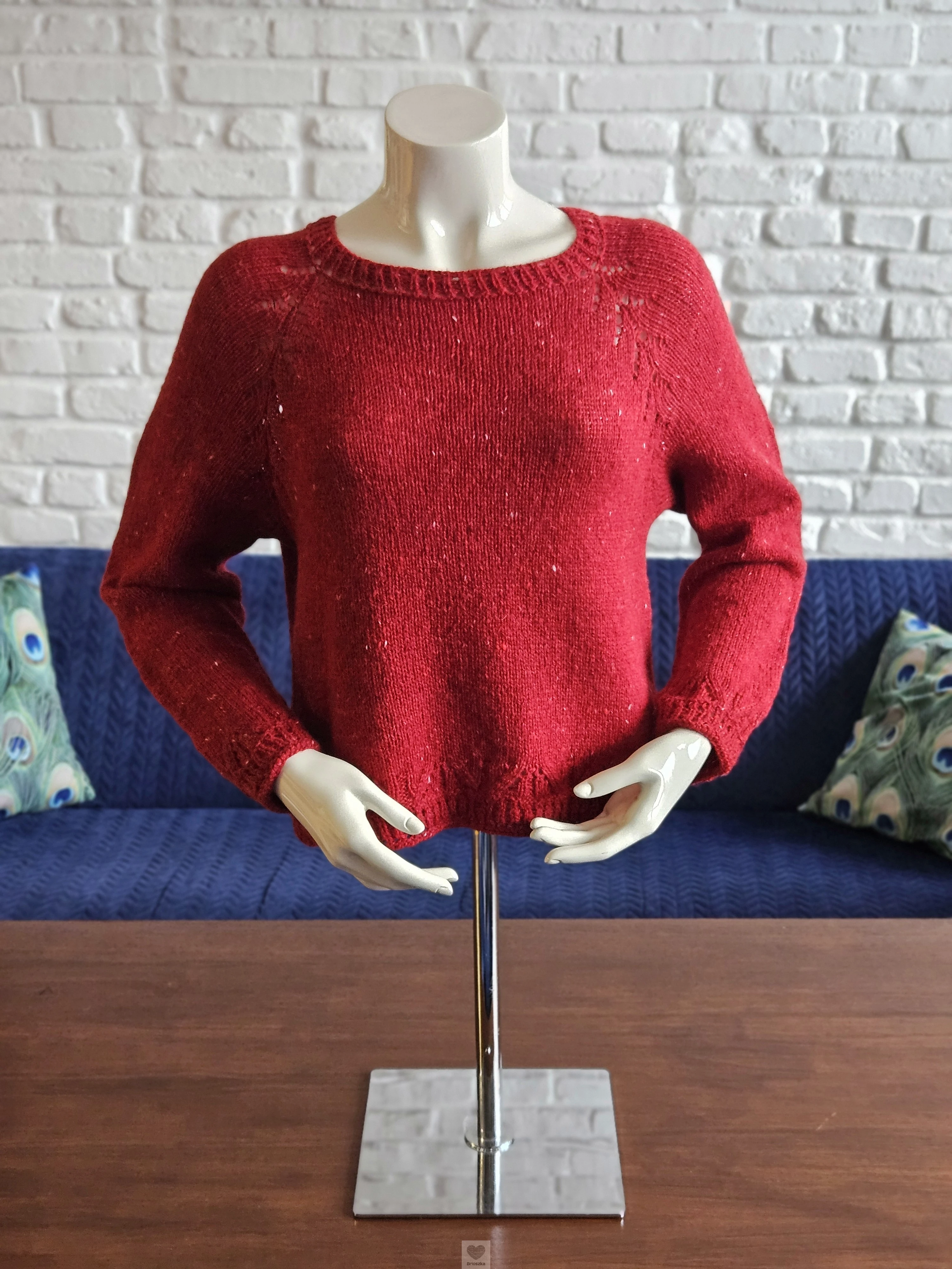 Wykonany z włóczki Andes Tweed marki Viking Garn, zachwyca głęboką, nasyconą czerwienią przełamaną charakterystycznymi tweedowymi drobinkami. Dzięki nim powierzchnia swetra nie jest jednolita – ma w sobie życie, strukturę i subtelną szlachetność, która pięknie pracuje w świetle i ruchu.