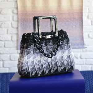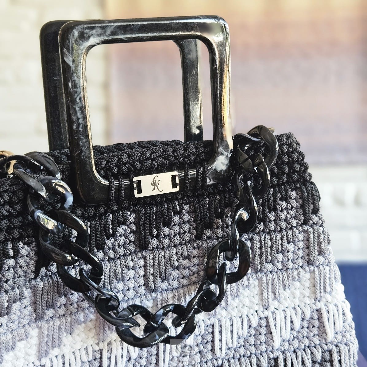 Nowoczesna forma, klasyczna paleta barw i kunszt rękodzieła – ta torebka to połączenie elegancji z wyrazistym charakterem. Ręcznie wykonana z bawełnianego sznurka techniką makramy, zachwyca geometrycznym wzorem w gradiencie od czerni, przez grafit, po popielaty odcień szarości.